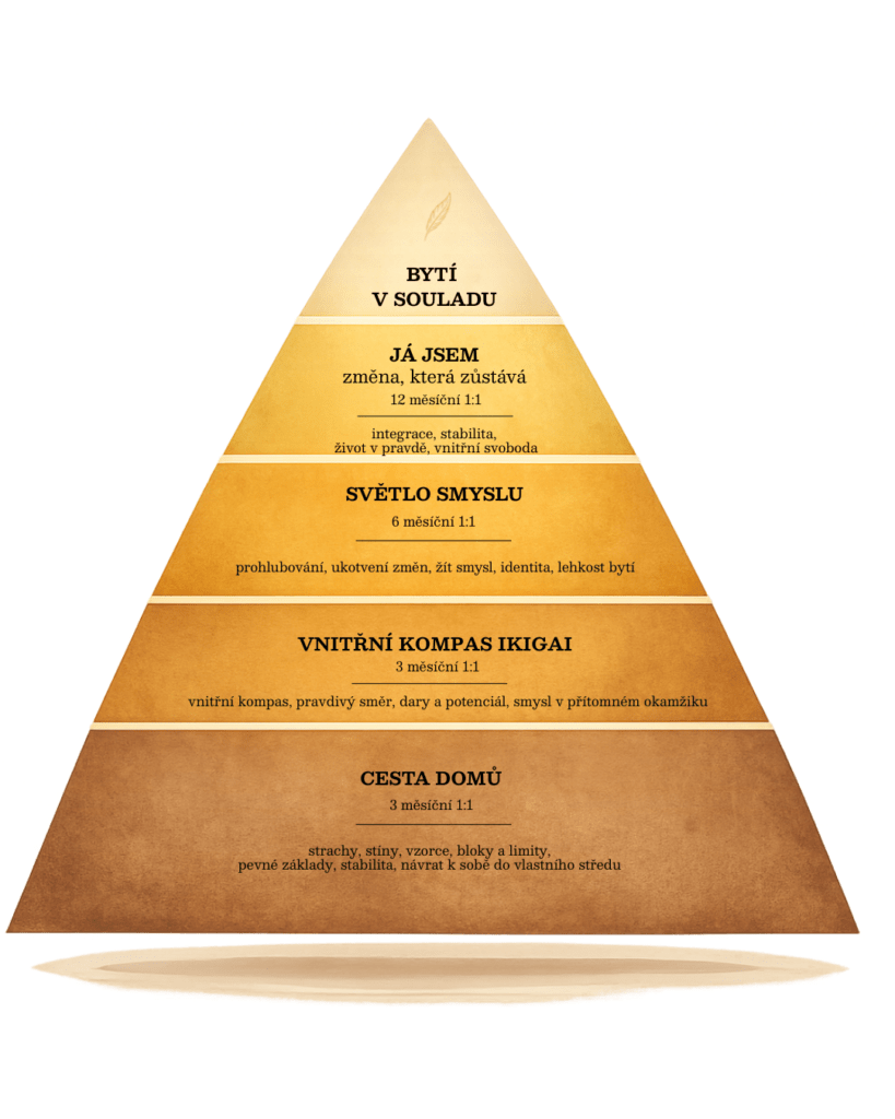 Pracuji s Pyramidou života. Jde o vědomou cestu, která člověka postupně vede od pevných základů přes nalezení smyslu až k dlouhodobé integraci změny do života.