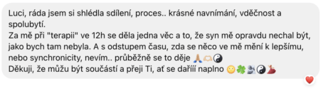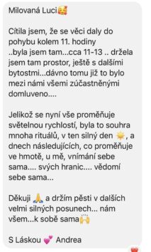 Luci je prostě andĕl, kterého mi Vesmír poslal ❤️ Mám chuť říct MILUJU TĚ za to, jak mě nakopla 😉 Luci mi dala jiný úhel pohledu na situaci, kterou jsem potřebovala vyřešit. Nevěděla jsem, jak mi pomůže, ale věděla jsem, že ji mám kontaktovat a má intuice se nemýlila. Luci mě ubezpečila, že je vše v pořádku. S její empatií jsem se cítila v objetí lásky, nesouzená, úžasná. Luca má dar nadhledu a komunikace a klidu. DÍKY DÍKY DÍKY