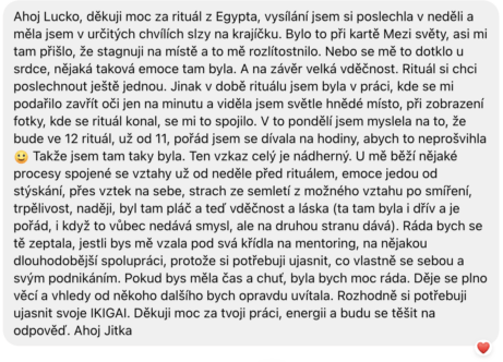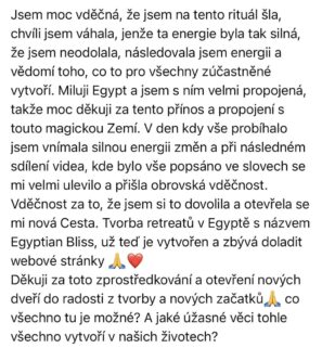 Tento rituál je doslova magický. Již jsem dva rituály v energetickém propojení na dálku z Egypta realizovala a výsledky účastníků byly fenomenální. Je to silný energetický impulz, který nám všem pomůže vykročit na cestu plnou změn a růstu. Egypt, posvátná a magická země, která mi doslova změnila život, bude naším energetickým spojením, které nám pomůže propojit naše energie a vykročit směrem ke změně.